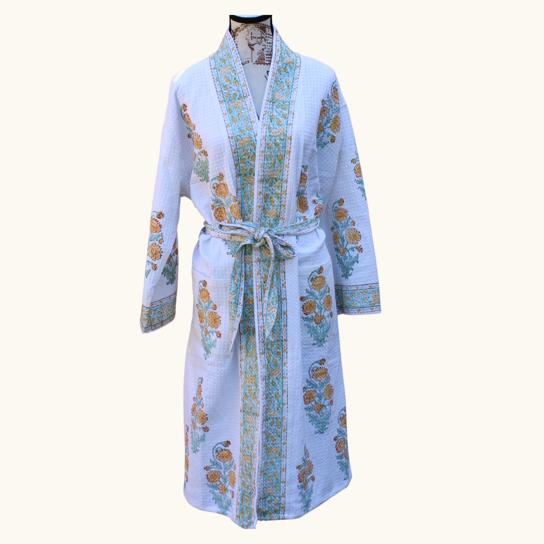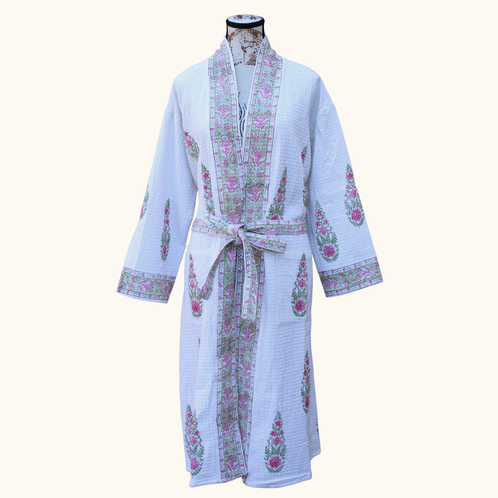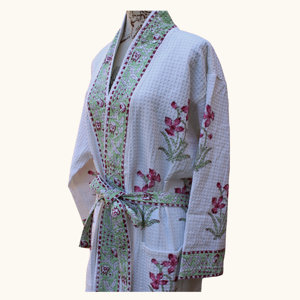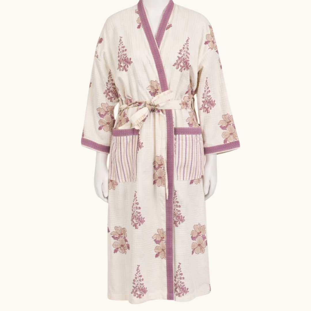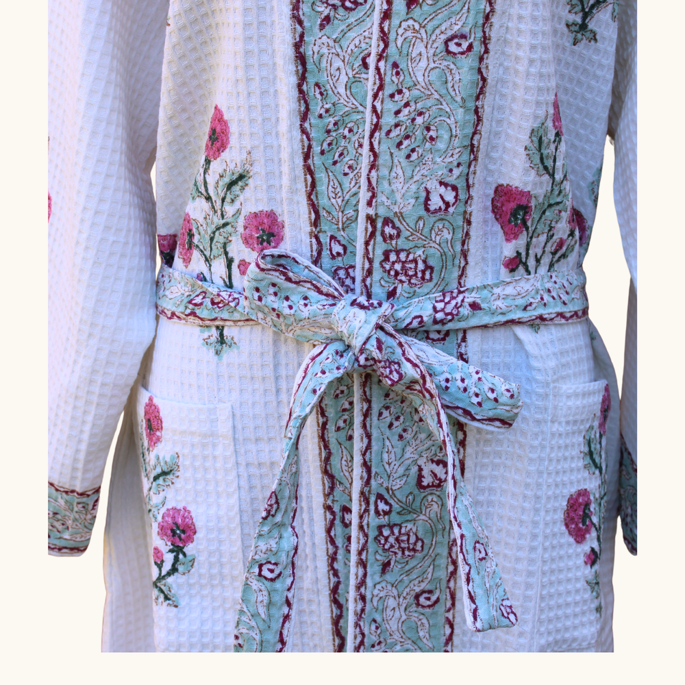 Our cotton robes are artisan-made in Jaipur, India. Hand block-printed in small batches using breathable waffle cotton which softens with every wash. With delicate prints, relaxed silhouettes, and a buttery-soft feel, these robes bring together timeless style and everyday ease. Lightweight, machine washable and a great one size fits all.