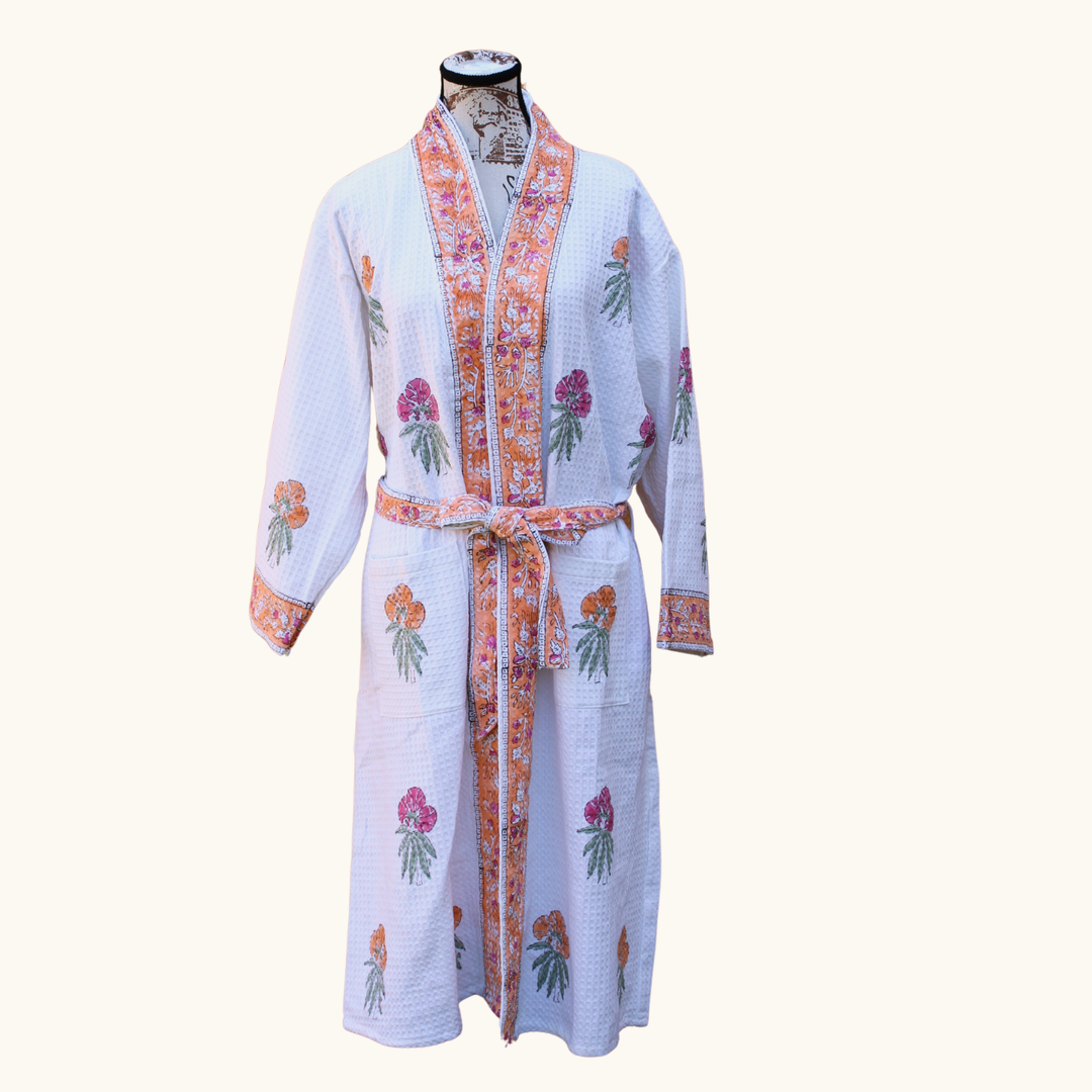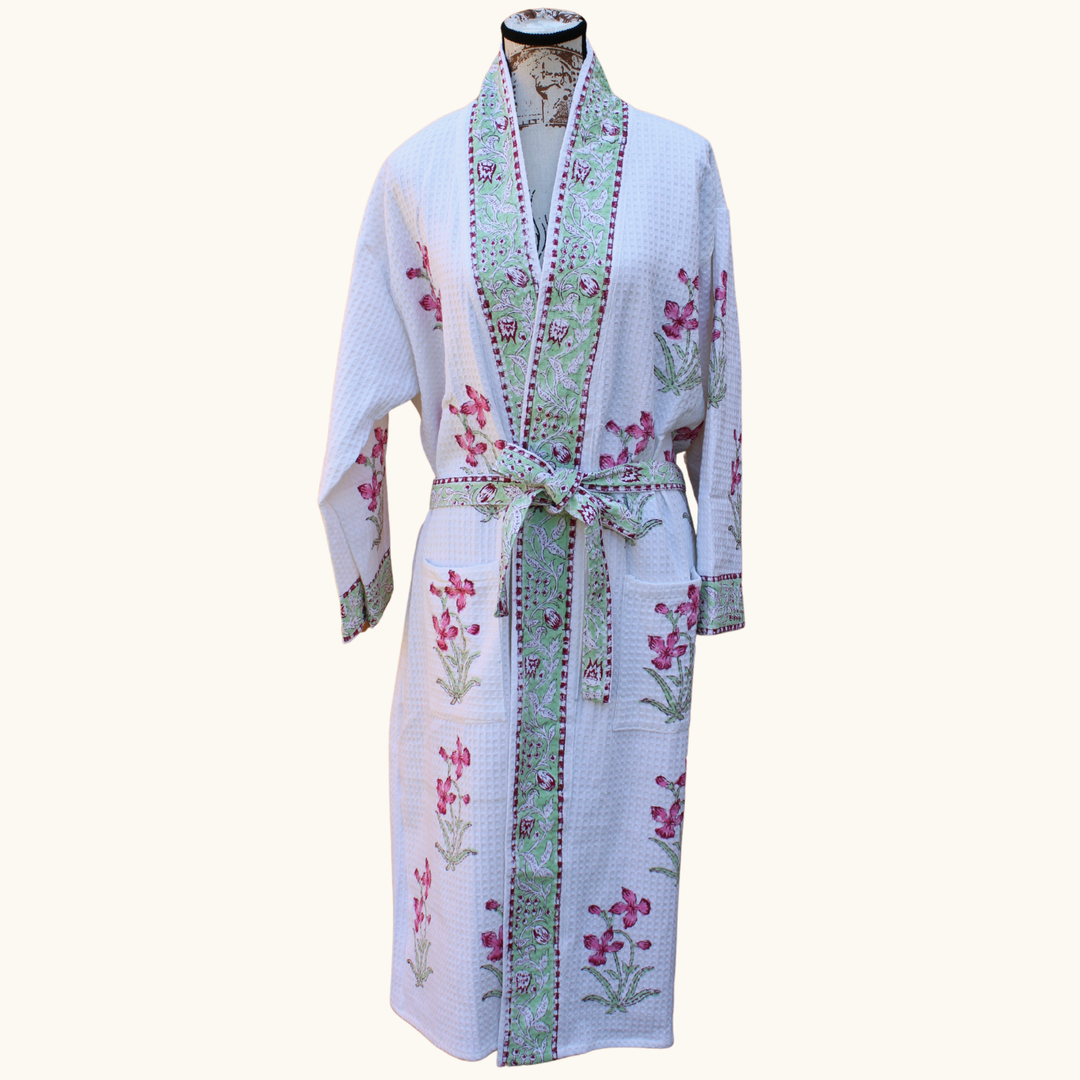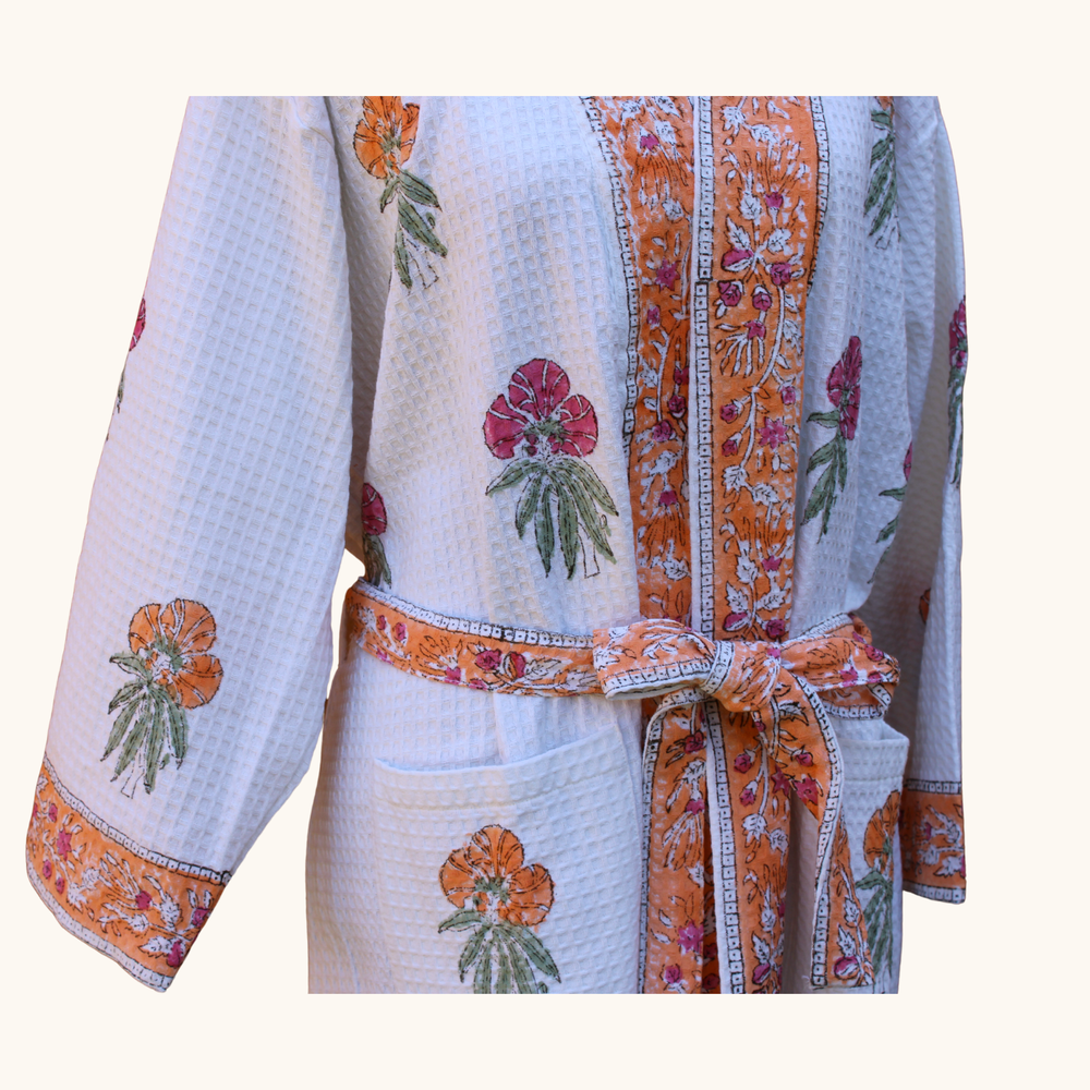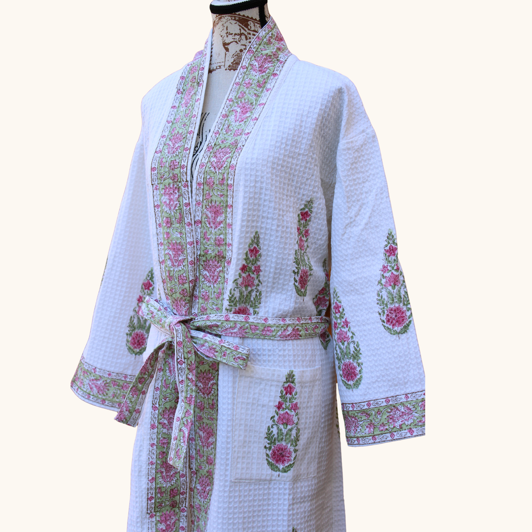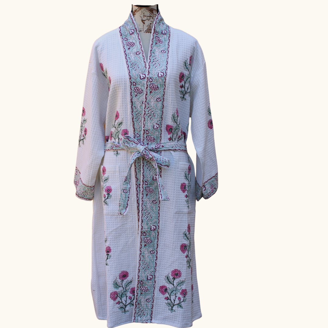Our cotton robes are artisan-made in Jaipur, India. Hand block-printed in small batches using breathable waffle cotton which softens with every wash. With delicate prints, relaxed silhouettes, and a buttery-soft feel, these robes bring together timeless style and everyday ease. Lightweight, machine washable and a great one size fits all.