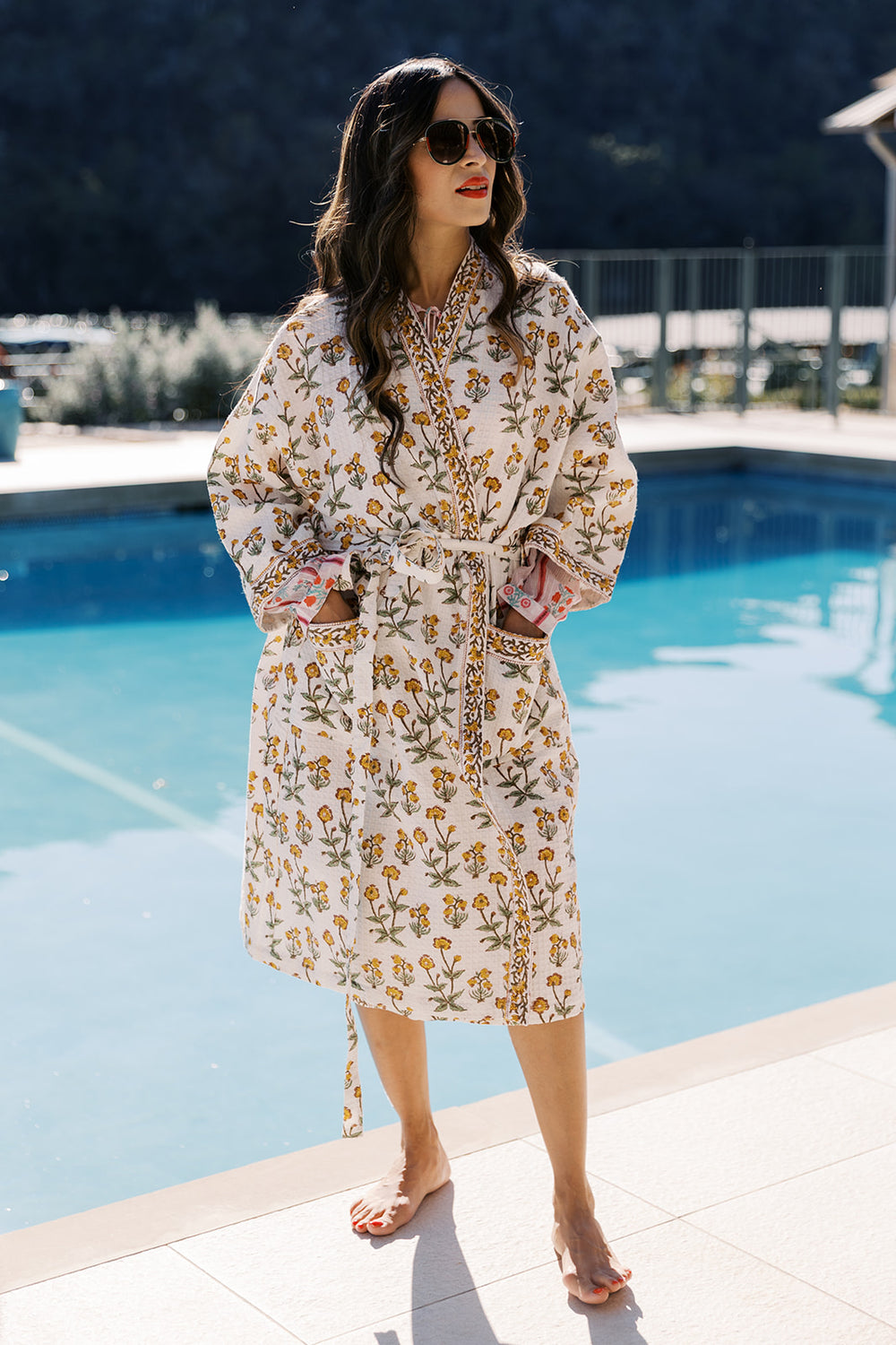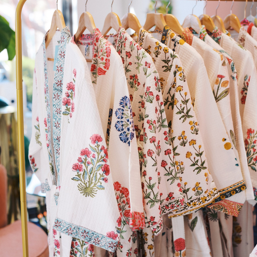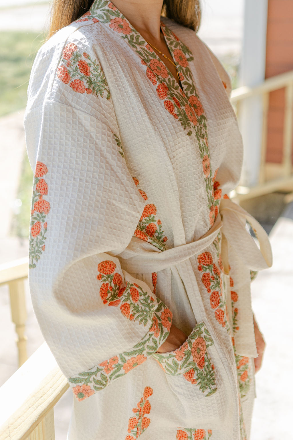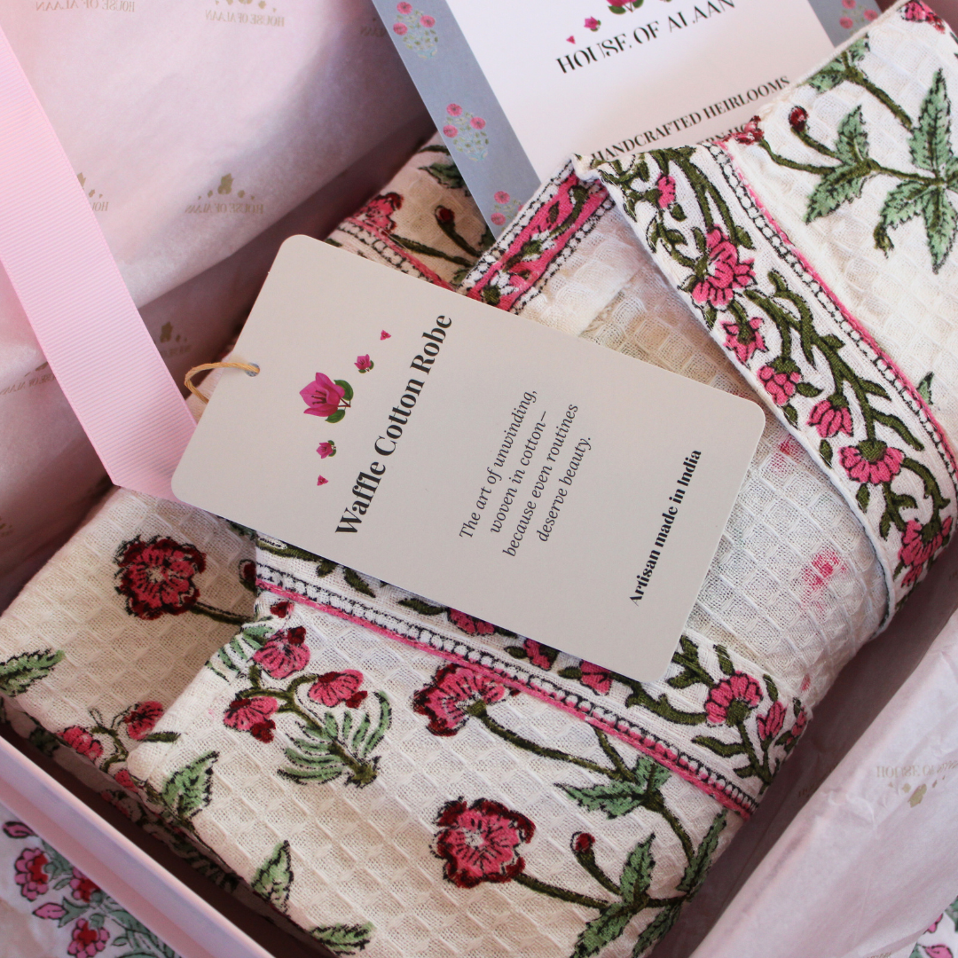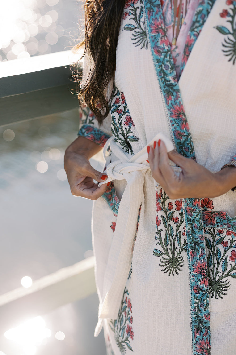 Our cotton robes are artisan-made in Jaipur, India. Hand block-printed in small batches using breathable waffle cotton which softens with every wash. With delicate prints, relaxed silhouettes, and a buttery-soft feel, these robes bring together timeless style and everyday ease. Lightweight, machine washable and a great one size fits all.