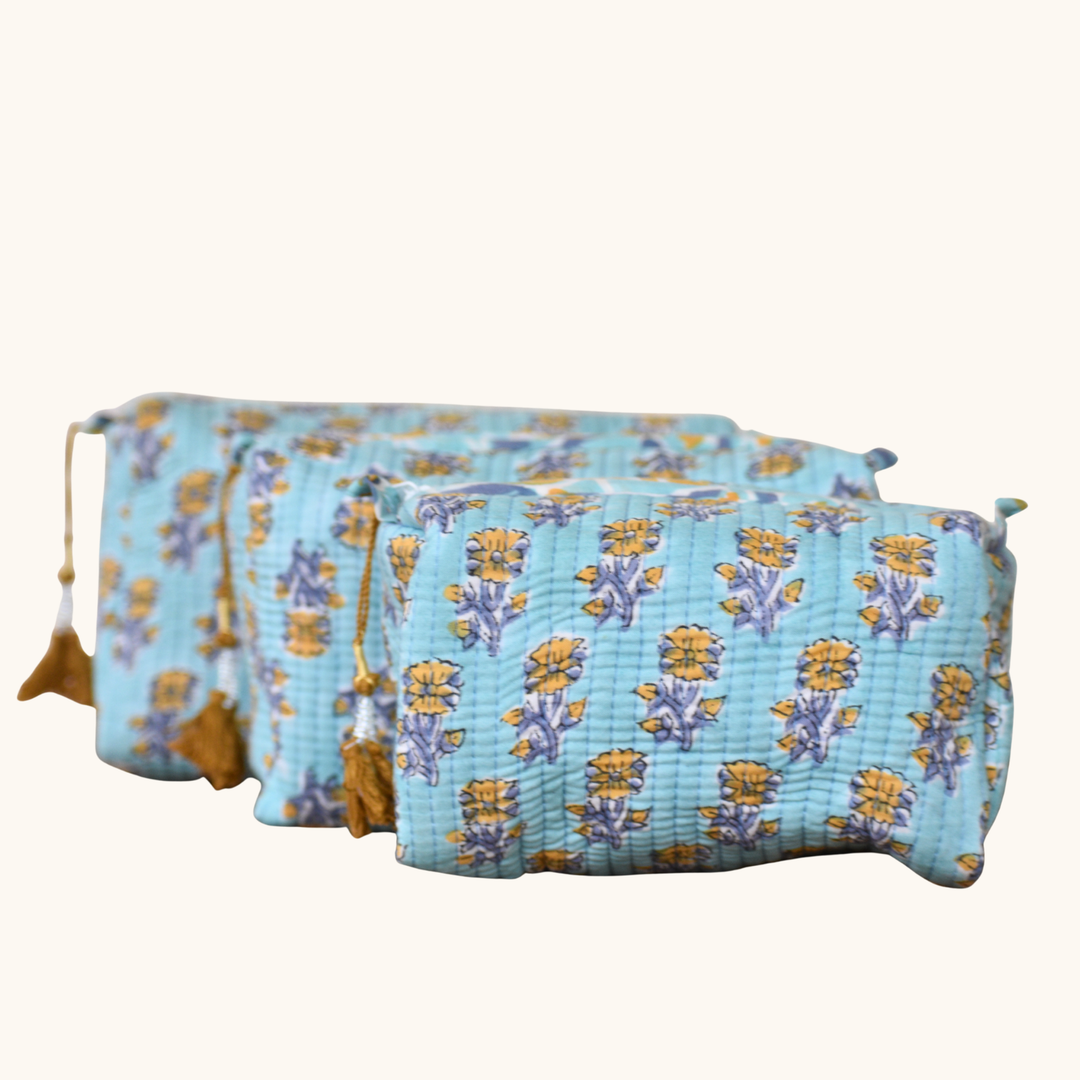 Our block-printed bags and travel pouches are perfect for organizing essentials—whether you're packing for a getaway, slipping one into your everyday tote, or styling your bathroom shelf. Handcrafted by artisans in India using traditional block printing techniques, each pouch is lined, lightweight, and finished with thoughtful details. Available in a range of prints and sizes, these cotton pouches are ideal for travel, beauty storage, gifting, and everyday rituals.