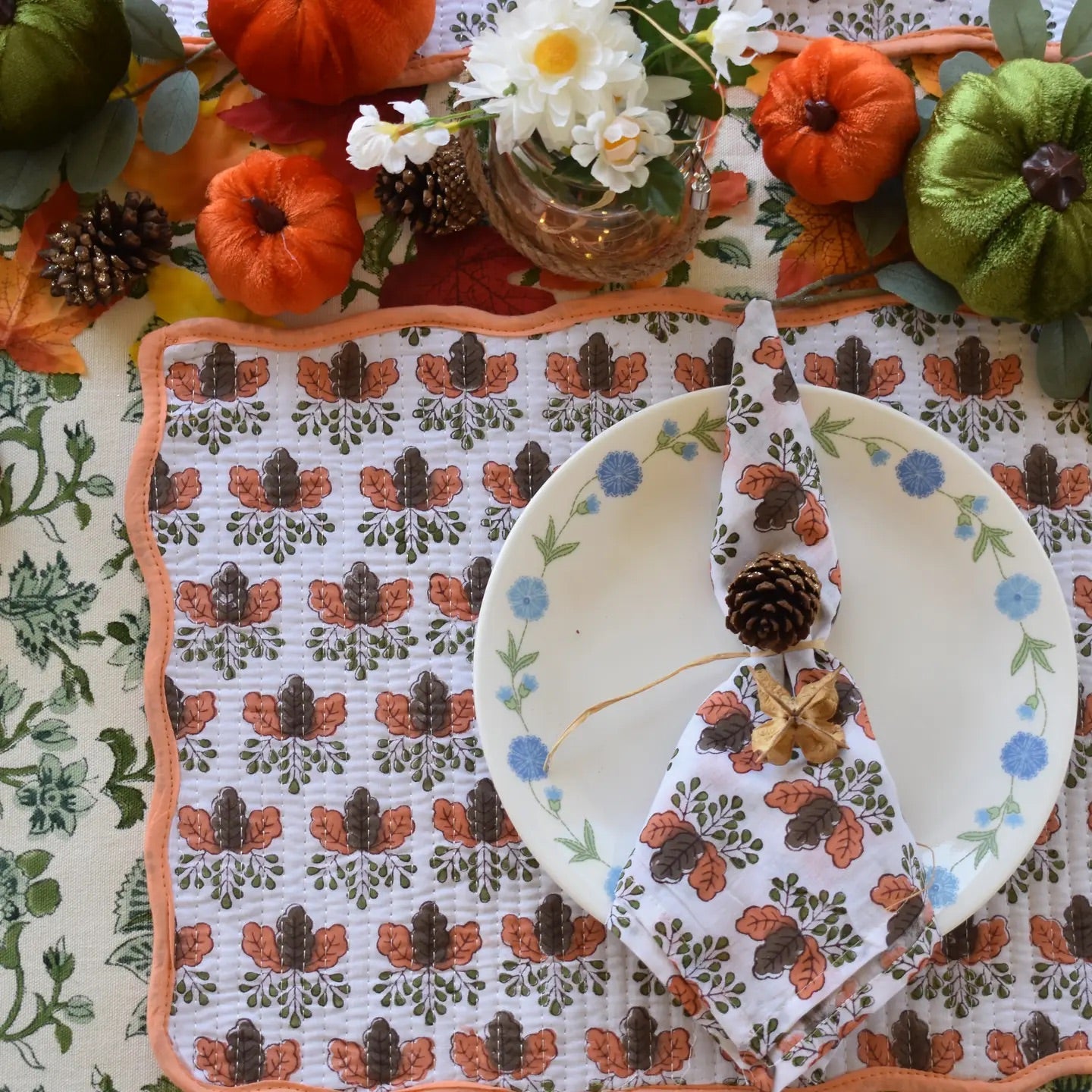 Brighten your table with our Harvest Oak placemats — hand block-printed with warm oak leaf motifs in earthy browns, burnt orange, and olive green. Each quilted placemat is reversible, offering two coordinating prints for styling versatility. Ethically made in Jaipur from soft cotton and finished with a scalloped edge.